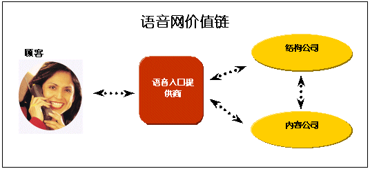 許多語音入口提供商向個人和公司提供語音網(wǎng)上的服務(wù),而內(nèi)容和結(jié)構(gòu)公司則向這些入口提供商提供技術(shù)支持、產(chǎn)品和主機(jī)服務(wù)。