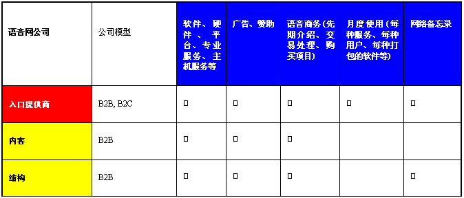 “第一個吃螃蟹”的公司僅僅注重提供語音入口服務(wù),語音網(wǎng)使這些公司有機(jī)會通過電話經(jīng)營互聯(lián)網(wǎng)商務(wù)模型。