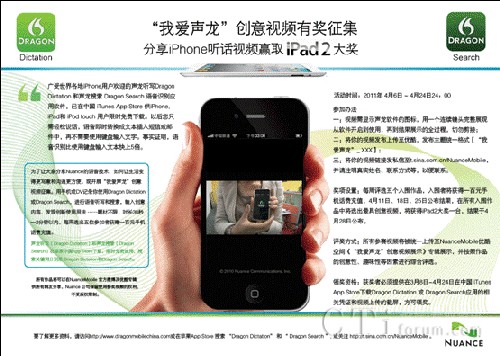 為了讓大家分享Nuance的語音技術(shù)如何改變我們的生活,讓生活變得更寫意和溝通更方便,Nuance 公司發(fā)起了“我愛聲龍”創(chuàng)意視頻征集活動(dòng)。用手機(jī)或DV記錄下你使用Dragon Dictation 或Dragon Search,進(jìn)行語音聽寫和搜索,輸入創(chuàng)意內(nèi)容、發(fā)現(xiàn)創(chuàng)新使用方法……題材不限,時(shí)長(zhǎng)30秒—2分鐘以內(nèi)。每周選出五位參加者獲贈(zèng)一百元手機(jī)話費(fèi)充值。