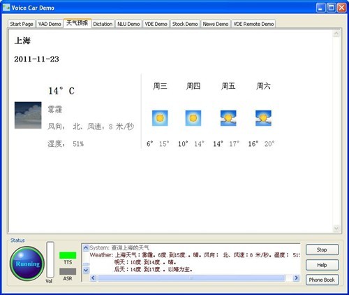 比方說(shuō)這個(gè)關(guān)于空調(diào)問(wèn)題,我們過(guò)去,空調(diào)的命令詞是“把空調(diào)打開(kāi),空調(diào)溫度提高3度!爆F(xiàn)在我也可以這樣說(shuō),空調(diào)調(diào)高一點(diǎn),我有點(diǎn)冷,也可以。就是你在車(chē)?yán)镞呁耆梢杂媚阕约旱恼Z(yǔ)言來(lái)說(shuō)你想干的事。比如說(shuō),前邊你不知道明天天氣會(huì)怎么樣,人一般都會(huì)想想,明天天氣如何,或者是告訴我天氣預(yù)報(bào)。但是你也可以這樣說(shuō)。明天會(huì)下雨嗎?也可以這樣說(shuō)。或者你這樣說(shuō),你說(shuō),今天大盤(pán)怎么樣。完全是用自然語(yǔ)言來(lái)說(shuō)。堵不堵車(chē),“查詢(xún)交通情況!边@就是,實(shí)際上可以有各種不同的說(shuō)法來(lái)完成這個(gè)任務(wù),這是我們自然語(yǔ)言的一個(gè)演示。