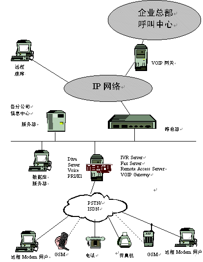 隨著信息技術(shù)的發(fā)展,企業(yè)對通訊的需求越來越多,并越來越呈現(xiàn)多樣性,有語音通訊,傳真通訊,數(shù)據(jù)通訊等。我們拿銀行作為一個例子來分析,目前我國大多數(shù)大型商業(yè)銀行都在各個市(甚至縣)建有一個IVR交互式語音應(yīng)答系統(tǒng)以滿足其客戶的語音查詢需求;同時,系統(tǒng)也要具備傳真通訊功能,以滿足某些大客戶需要傳真回復確認的需求;目前,各個商業(yè)銀行也建立了自己的企業(yè)銀行平臺,所以中心也需構(gòu)建一個接入服務(wù)器來滿足某些大客戶的遠程撥號接入進行遠程交易;隨著Call center 應(yīng)用的興起,各商業(yè)銀行的省行呼叫中心需要將其各市行的語音接入平臺(IVR),通過VoIP 技術(shù),接入到省行的Call Center 中心,從而建立一個分布式的Call Center,以提高對其客戶服務(wù)的滿意度 。