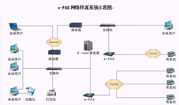 e-FAX網(wǎng)絡(luò)傳真機(jī) 的工作原理是利用內(nèi)部設(shè)備對(duì)傳真和語(yǔ)音信號(hào)的存儲(chǔ)及轉(zhuǎn)換功能,在網(wǎng)絡(luò)配置許可的范圍內(nèi) , 主要實(shí)現(xiàn)了自動(dòng)接收和發(fā)送傳真的功能。系統(tǒng)內(nèi)用戶能通過電子郵件和網(wǎng)頁(yè)方式收取自己的傳真或語(yǔ)音,發(fā)送傳真時(shí)只需要提交傳真給傳真服務(wù)器,服務(wù)器能自動(dòng)發(fā)送。系統(tǒng)外用戶能在語(yǔ)音流程的提示下發(fā)送或接收傳真,也可以選擇發(fā)送留言信息。系統(tǒng)管理員則可以對(duì)系統(tǒng)進(jìn)行參數(shù)配置,流程定制和用戶信息管理等功能操作。
