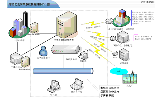 如拓樸圖所標(biāo),寧波市政府、寧波水利局與奉化市三防辦均采用了加拿大Eicon 公司與拓敏聯(lián)合推出的傳真服務(wù)器系統(tǒng),可進行針對需求的智能設(shè)定傳真發(fā)送。