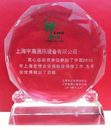 宇高通訊榮獲“2010世博安保貢獻(xiàn)獎”