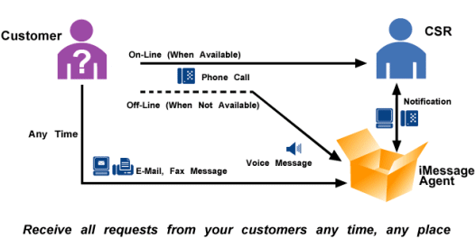 iMessage Agent可與您已有的ACD系統(tǒng)集成,當(dāng)目標(biāo)CSR不在時電話系統(tǒng)就將呼叫交付給iMessage Agent,iMessage Agent接到呼叫之后將對呼叫方進(jìn)行合適的問候,再將消息存儲在郵件服務(wù)器中。根據(jù)預(yù)定義的規(guī)則,消息會被隨后路由到正確的消息框中。
