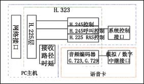 用語音卡來搭建IP超市的核心在于如何用語音卡來搭建一個VoIP的語音網(wǎng)關(guān)。由于增加了VoIP功能,與傳統(tǒng)的CTI集成相比較,用語音卡來搭建一個VoIP的語音網(wǎng)關(guān),更富有挑戰(zhàn)性:語音卡除需要實現(xiàn)原有的模擬或數(shù)字電路接口外,還需要實現(xiàn)語音壓縮的編解碼、語音在IP網(wǎng)的傳輸協(xié)議以及解決好由此而產(chǎn)生的如回聲消除、靜音抑制、去時延抖動、QoS控制等問題。語音編碼標(biāo)準(zhǔn)一般要支持G.729、G.723等,目前國內(nèi)絕大多數(shù)VoIP網(wǎng)絡(luò)采用H.323協(xié)議棧,從兼容性考慮,用語音卡搭建的VoIP語音網(wǎng)關(guān)也應(yīng)采用H.323協(xié)議。其結(jié)構(gòu)如圖1所示。