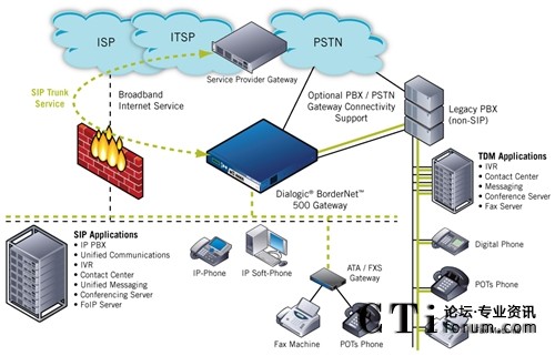 本頁的圖表顯示了在企業(yè)網絡中Dialogic® BorderNet™ 500網關的部署。