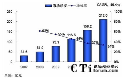 再來看看統(tǒng)一市場的前景,下圖是某咨詢公司對國內(nèi)統(tǒng)一通信市場的預(yù)測數(shù)據(jù),2012年將達(dá)到212億元,盡管可能存在一定水份,但這么多公司介入這個市場,本身就體現(xiàn)了發(fā)展?jié)摿,這點(diǎn)不容懷疑。
