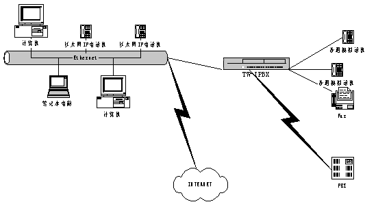 在一個有很多分支機構的大企業(yè)的分部安裝Tw-IPBX ,通過IP 網絡與企業(yè)總部PBX 連接后后,可實現多種應用,同時降低了成本。在這種應用場景中,采用了基于IP 的傳輸機制(VoIP)。此種情況下VoIP的美好之處在于語音和數據的IP 傳輸管路需求(根據呼叫)的無縫可伸縮性,而無需任何靜態(tài)的分區(qū),這種解決方案可提供性能價格比極高且靈活的網絡運作。