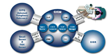 CICM是ITI解決方案中的核心模塊,該模塊完成系統(tǒng)涉及到互聯(lián)網(wǎng)的所有通話的控制,包括VOIP、E-mail、Chatting、畫像通話等。而該模塊與CICR的連動正是完成CTI和ITI技術(shù)完美結(jié)合的關(guān)鍵。即當一個網(wǎng)上呼叫呼入時,由CICR返回所分配的話務(wù)員相關(guān)信息(如:IP),然后CICM將該信息送給客戶使得網(wǎng)絡(luò)聊天和WEB到電話的通話得以同步。而CCPM