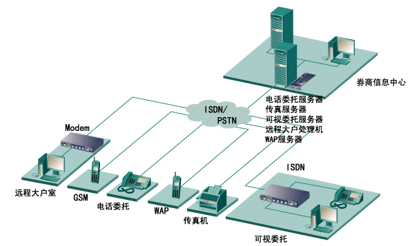 券商證券委托一般包括:電話傳真委托、可視委托(又稱遠程大戶室)和網(wǎng)上委托等。其中除網(wǎng)上委托可通過Internet網(wǎng)外,其它委托必須通過PSTN網(wǎng)來連接。在當前階段,此類委托占有最大的客戶群。以前,每個券商為了實現(xiàn)此類委 托,必須在券商中心的機器上安裝語音卡、傳真卡、座席卡來滿足電話傳真委托,另外還必須在另外一臺機器上安裝多串口卡和Modem Pool與座席卡相連來滿足可視委托,遠程大戶室等業(yè)務。此方案,用戶不僅需要購買很多卡,占用很多機器插槽,而且在實現(xiàn)可視委托時,只能接受客戶端PSTN模擬Modem的呼叫,而不能接收目前ISDN的連接方式,速度非常緩慢。本文主要提出了一種采用Eicon Diva Server PRI卡的新型解決方案,本方案不僅省去了在中心插上傳真卡、語音卡、座席卡多種卡,又省去了多串口卡和Modem Pool構件,只需在中心的一臺機器插上1-4塊Diva Server PRI卡后,便能滿足你電話傳真委托、可視委托 、遠程大戶室等多種業(yè)務,還支持WAP呼叫,SMS短消息發(fā)送等,在可視委托和遠程大戶室業(yè)務中,不僅支持PSTN Modem的模擬呼叫,也支持ISDN的數(shù)字呼叫,方案的性價比極高,方案連接圖如下圖所示: