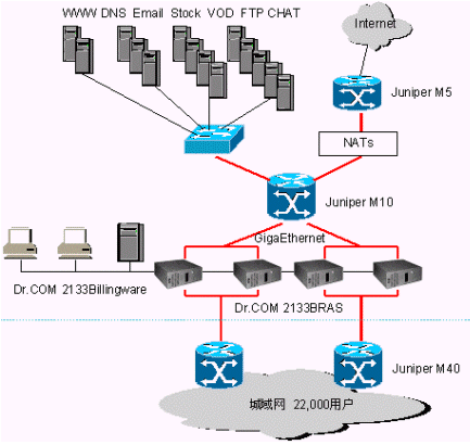 目前寬帶網(wǎng)上對用戶認證計費的技術手段有三種,一是二層的PPPOE技術,二是二、三層通用的WEB認證技術。三是運用隧道技術的L2TP。三種技術各有千秋,小區(qū)運營商應該根據(jù)自己網(wǎng)絡的特點和投資情況審慎選擇。比較一致的看法是采用ADSL接入方式的運營商必須選用PPPOE技術,采用FTTB+LAN接入方式的運營商則必須選擇非PPPOE技術,三層的WEB認證技術是最省錢也是最易行的解決方案。為了說明這個問題,下面我們結合一個寬帶網(wǎng)絡實例,將Dr.COM的三層認證技術與PPPOE作一個對比。