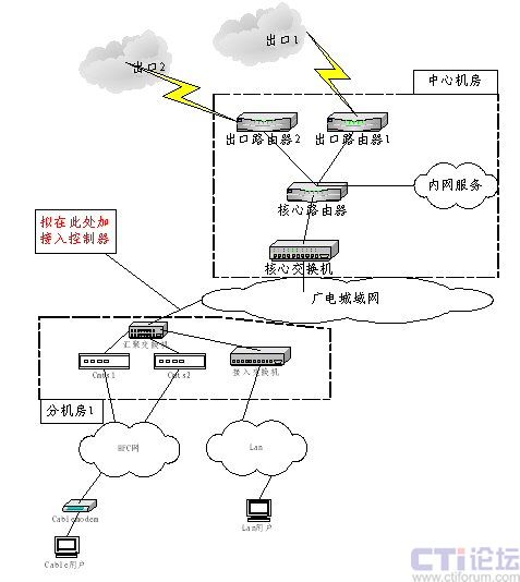 南通廣電目前的IP網(wǎng)絡(luò)拓?fù)淙缦聢D所示,現(xiàn)有電視塔總前端機(jī)房1個(gè);分機(jī)房共有4個(gè),每個(gè)分機(jī)房的情況相同。個(gè)人用戶以cable modem用戶為主,用戶通過HFC網(wǎng)絡(luò)接入頭端(cmts),再經(jīng)匯聚交換機(jī)接入廣電城域網(wǎng)后經(jīng)電視塔總前端機(jī)房訪問internet,新的頭端系統(tǒng)采用Cisco 公司的ubr10012和ubr7246,目前暫決定cable modem和用戶的PC設(shè)備均通過DHCP服務(wù)器(Cisco 的CNR軟件)獲得IP地址;Lan用戶除接入方式不同外,IP地址采用靜態(tài)分配的辦法。目前廣電為部分個(gè)人用戶分配公網(wǎng)IP地址,其他個(gè)人用戶分配私網(wǎng)地址由出口防火墻通過NAT完成地址轉(zhuǎn)換。