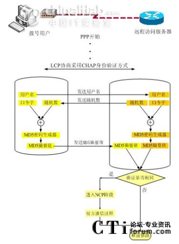 Protocol,PAP)和質(zhì)詢握手協(xié)議(Challenge Handshake Authentication Protocol,CHAP)。如果雙方協(xié)商達(dá)成一致,也可以不使用任何身份認(rèn)證方法。質(zhì)詢握手協(xié)議認(rèn)證(CHAP)相比口令驗(yàn)證協(xié)議認(rèn)證(PAP)安全性更高,因?yàn)镃HAP不在線路上發(fā)送明文密碼,而是發(fā)送經(jīng)過摘要算法加工過的隨機(jī)序列,也被稱為"挑戰(zhàn)字符串".如下圖所示。