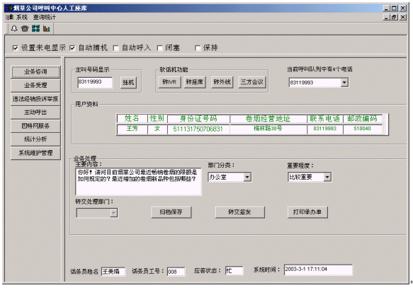 煙草公司呼叫中心將接入功能、導(dǎo)航功能、自動語音查詢功能、人工座席服務(wù)功能、話路轉(zhuǎn)接功能、信息資料處理緊密聯(lián)系起來。用戶撥打特服電話號碼后,可以根據(jù)需要選擇人工服務(wù)、自動語音查詢、自動留言,并能夠在幾種服務(wù)中來回切換或轉(zhuǎn)接其它電話;所記錄的資料可以分門別類的進(jìn)行統(tǒng)計(jì)并形成報(bào)表,供相關(guān)部門進(jìn)行檢索查閱;意見處理完畢,可由座席主動呼叫用戶,告知處理意見,形成閉環(huán)處理流程。