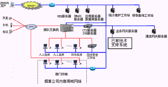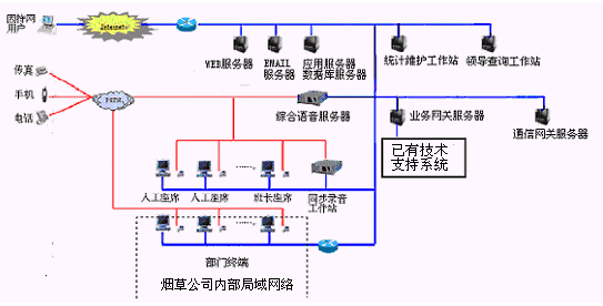 卷煙經(jīng)銷戶等客戶利用電話、傳真、電子郵件、因特網(wǎng)、手機(jī)、短消息等撥打統(tǒng)一的特服號碼(如800XXX或9XXXX)進(jìn)入煙草公司呼叫中心,本系統(tǒng)依托煙草公司各類業(yè)務(wù)技術(shù)支持系統(tǒng)和網(wǎng)絡(luò)系統(tǒng),實(shí)現(xiàn)煙草專賣局原有管理系統(tǒng)/業(yè)務(wù)系統(tǒng)及數(shù)據(jù)庫的無縫連接,通過人工受理或自動語音服務(wù)等方式全天24小時(shí)不間斷地為客戶提供各種服務(wù)。