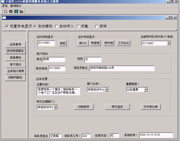 人民群眾打入電話后,當(dāng)系統(tǒng)的自動(dòng)語音應(yīng)答子系統(tǒng)無法解決客戶問題時(shí),客戶可選擇人工服務(wù),由企業(yè)客戶服務(wù)代表直接接聽客戶電話,處理并解決客戶問題。此時(shí)客戶同座席話務(wù)人員直接溝通,并同時(shí)記錄下該客戶的聯(lián)系方式,將相關(guān)數(shù)據(jù)添加入系統(tǒng)數(shù)據(jù)庫;也可以在數(shù)據(jù)庫的支持下回答質(zhì)量監(jiān)督咨詢、投訴等?蛻粢部梢赃x擇自動(dòng)語音服務(wù)方式,根據(jù)系統(tǒng)的語音提示輸入按鍵,選擇類別,將自己的投訴和建議以及自己的聯(lián)系方式信息以留言錄音的方式保存在系統(tǒng)中。系統(tǒng)同時(shí)還支持自動(dòng)傳真方式,客戶可以通過傳真機(jī)進(jìn)入本系統(tǒng),通過按鍵選擇傳真方式,將自己的意見建議等的文本內(nèi)容傳真給系統(tǒng),系統(tǒng)自動(dòng)接受并存入數(shù)據(jù)庫。