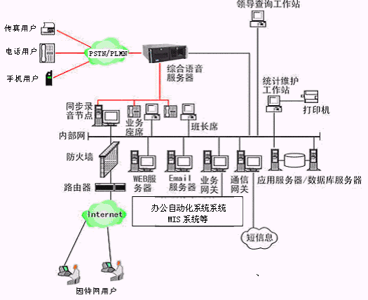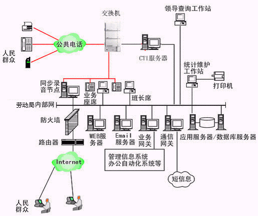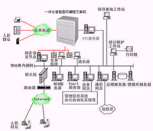 勞動局多媒體呼叫中心系統(tǒng)主要是由智能型可編程交換機(jī)或帶語音板卡的工控機(jī)或排隊交換機(jī)、CTI服務(wù)器、IVR(交互式語音應(yīng)答)/IFR(交互式傳真應(yīng)答)子系統(tǒng)、人工座席子系統(tǒng)、應(yīng)用服務(wù)器、數(shù)據(jù)庫服務(wù)器、業(yè)務(wù)網(wǎng)關(guān)子系統(tǒng)、WEB服務(wù)器、電子郵件服務(wù)器、防火墻、通信網(wǎng)關(guān)等硬件設(shè)備和應(yīng)用軟件組成。