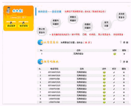 彩話業(yè)務(wù)系統(tǒng)BYBGM2.0功能強大,它允許將被叫分為不同的組或者將其設(shè)置為特殊號碼,這樣將可以設(shè)置他們的默認(rèn)背景音樂,還可以針對他們設(shè)置紀(jì)念日或者按照不同的時段設(shè)置不同的背景音樂。當(dāng)用戶喜歡幾首音樂但又不希望每次都聽相同的音樂時,可以將一定數(shù)目的音樂設(shè)置為一個音樂盒(Music-Box),這樣系統(tǒng)會每次到音樂盒中隨機選取一首音樂作為彩話背景音樂。系統(tǒng)中提供的音樂素材不能滿足用戶的需求時,用戶可以通過"彩話DIY"服務(wù)自己錄制音樂素材到系統(tǒng)中或?qū)⒅付ǜ袷降囊魳匪夭纳蟼鞯较到y(tǒng)中,充分展現(xiàn)自己的個性和創(chuàng)作才華。在通話過程中,用戶也可以隨心所欲控制彩話,這就是"隨心變奏"服務(wù),通過它用戶可以在通話過程中變換彩話背景音樂或音量的大小,這就使得用戶甚至可以編制一個通話場景(不同的背景音樂、不同的音效),并可以根據(jù)被叫的反應(yīng)及時加以控制,從而得以充分展現(xiàn)自己的通話魅力。