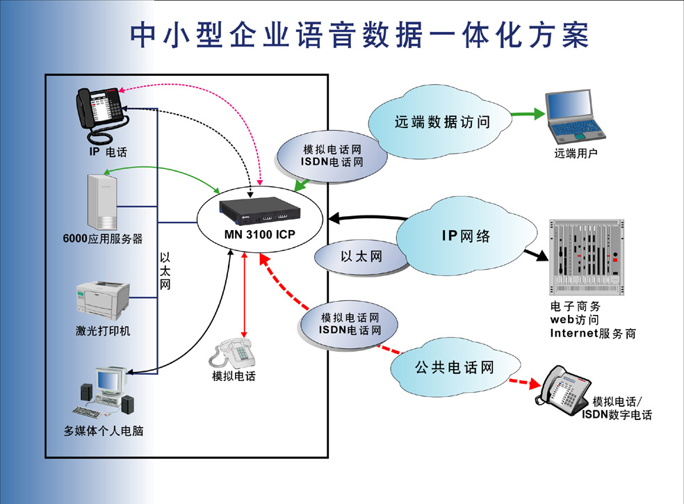 商務(wù)電話系統(tǒng)、本地網(wǎng)和網(wǎng)關(guān)集成在統(tǒng)一的平臺上?敏迪網(wǎng)絡(luò)推出的MN3100綜合通信平臺就是這樣簡單快捷的滿足您的需要,它是專為小型企業(yè)或大型企業(yè)的分支機構(gòu)而設(shè)計的語音數(shù)據(jù)集成的解決方案。