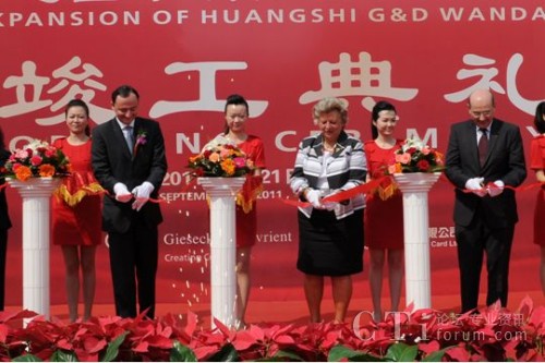 2011年9月21日, 湖北黃石。 黃石捷德萬(wàn)達(dá)金卡有限公司在湖北黃石的工廠舉辦竣工典禮,慶祝公司第四期廠房擴(kuò)建項(xiàng)目順利竣工并投入使用。