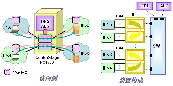 可以在ALG 刀片上搭載將DNS咨詢進行IPv6-IPv4轉(zhuǎn)換的ALG功能。與轉(zhuǎn)換服務器刀片協(xié)作可以實現(xiàn)IPv6與IPv4的雙方向通信。