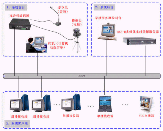 可通過單播或多播方式將現(xiàn)場的視頻、音頻、計(jì)算機(jī)動(dòng)態(tài)屏幕在網(wǎng)絡(luò)上進(jìn)行直播,客戶端可通過直播接收軟件接收到視頻、音頻、計(jì)算機(jī)動(dòng)態(tài)屏幕信息,采用組播方式時(shí)接收端數(shù)據(jù)沒有限制,可以在遠(yuǎn)程完整再現(xiàn)會(huì)場或教室的實(shí)況。