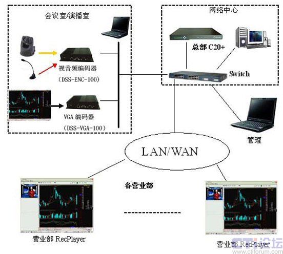 在分析了華安證券的實(shí)際需求和網(wǎng)絡(luò)環(huán)境以后,決定采用一套DSS-R-C20+來組建整個(gè)流媒體系統(tǒng)。系統(tǒng)由媒體采集系統(tǒng)視音頻編碼器(DSS-ENC-100)/VGA編碼器(DSS-ENC-100),流媒體處理和錄制系統(tǒng)(C20+)和客戶端RecPlayer組成。通過此系統(tǒng)可以實(shí)現(xiàn)語(yǔ)音、視頻和計(jì)算機(jī)桌面的同步實(shí)時(shí)直播、錄制和點(diǎn)播。系統(tǒng)的結(jié)構(gòu)圖如下: