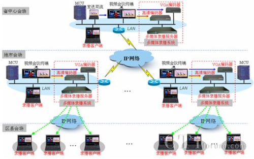 項(xiàng)目中采用了17套銳取高清錄播系統(tǒng),分別部署省國稅及下轄16個(gè)州、市國稅。銳取高清錄播系統(tǒng)采用分布式產(chǎn)品架構(gòu),由多媒體錄播服務(wù)器和前端的編碼器組成。多媒體錄播服務(wù)器部署在網(wǎng)絡(luò)機(jī)房;高清編碼器和VGA編碼器分別部署在高清視頻會(huì)議室,編碼器從華為高清視頻會(huì)議終端獲取視音頻及雙流信號(hào),并通過IP網(wǎng)絡(luò)發(fā)送給機(jī)房內(nèi)多媒體錄播服務(wù)器,由多媒體錄播服務(wù)器實(shí)現(xiàn)視頻會(huì)議的錄制、直播和點(diǎn)播。分會(huì)場及不具備視頻會(huì)議終端的地方,可使用電腦登陸多媒體錄播服務(wù)器來接收會(huì)議的實(shí)時(shí)直播或在會(huì)后進(jìn)行點(diǎn)播。