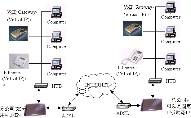 二、應用說明:完全基于企業(yè)現(xiàn)有網(wǎng)絡環(huán)境架設VOIP系統(tǒng),企業(yè)的各分支機構只需申請ADSL寬帶網(wǎng)絡(有條件的企業(yè)可申請專線及固定IP地址,則系統(tǒng)完全獨立),安裝晶卡開發(fā)的NOZA網(wǎng)守、IP話機或USB手柄電話,就可實現(xiàn)免費通話。