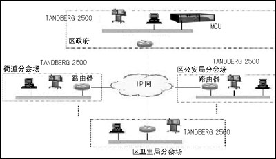 此次應(yīng)用的視頻會(huì)議終端位于東城區(qū)政府所轄范圍內(nèi)的各重要單位,通過(guò)H.323網(wǎng)絡(luò)召開(kāi)內(nèi)部工作會(huì)議,從而方便地實(shí)現(xiàn)實(shí)時(shí)交互式遠(yuǎn)程會(huì)議,會(huì)議電視系統(tǒng)設(shè)計(jì)使用速率支持1.5Mbps,控制方式采用全網(wǎng)星型集中式控制方式。