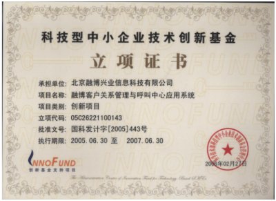 "融博客戶關(guān)系管理與呼叫中心應(yīng)用系統(tǒng)"喜獲國家里科技部2005年中小企業(yè)創(chuàng)新基金的立項(xiàng),以及中關(guān)村科技園區(qū)的創(chuàng)新基金!融博興業(yè)本次立項(xiàng)的產(chǎn)品是2005年北京地區(qū),乃至全國唯一獲得創(chuàng)新基金支持的CRM與呼叫中心應(yīng)用軟件項(xiàng)目。