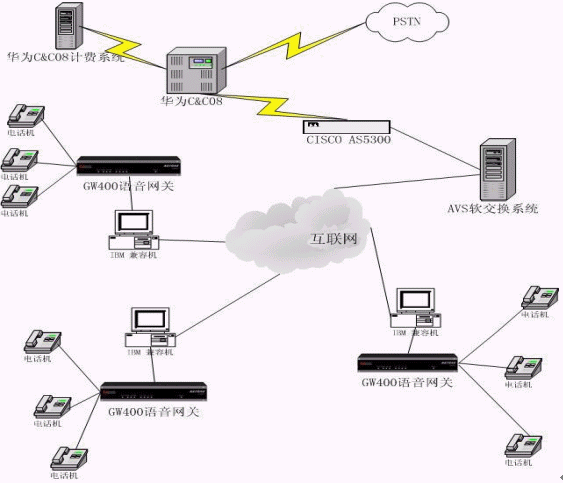 方案中使用到的設備與軟件有:普通電話機,語音網(wǎng)關,電腦,ABS計費軟件,上網(wǎng)設備,AVS軟交換系統(tǒng),CISCO AS5300,華為C&C08機計費系統(tǒng)