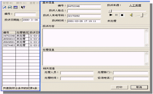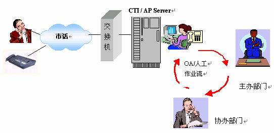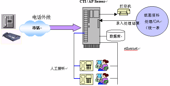 系統(tǒng)以計(jì)算機(jī)系統(tǒng)(CTI/AP Server)為核心,配備多功能呼叫中心卡及系統(tǒng)軟件。投訴人電話撥入時(shí),由計(jì)算機(jī)提示語(yǔ)音指導(dǎo)操作過程,例如選擇留言、人工投訴或者傳真。如已經(jīng)有一套辦公自動(dòng)化系統(tǒng)(OA),本系統(tǒng)可以和它連接(接口定制)使得投訴內(nèi)容自動(dòng)進(jìn)入OA流程;如果沒有OA系統(tǒng),則可以選擇將投訴內(nèi)容在打印機(jī)打。ū韱危┖筮M(jìn)入人工投訴處理流程,再由人工將處理的結(jié)果人工輸入CTI/AP Server以供查詢;如果需要訪問其它網(wǎng)絡(luò)資源,本系統(tǒng)提供電子郵件及URL的網(wǎng)絡(luò)資源訪問手段,使您輕松訪問網(wǎng)絡(luò)資源。