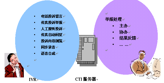 以CTI(計(jì)算機(jī)和電話集成)技術(shù)為系統(tǒng)核心,使投訴舉報(bào)人可以采用多種方式將信息轉(zhuǎn)達(dá)到相關(guān)部門設(shè)立的電話投訴舉報(bào)中心,待舉報(bào)處理完畢后收集處理結(jié)果并登記入數(shù)據(jù)庫(kù),傳遞供各級(jí)領(lǐng)導(dǎo)處理。