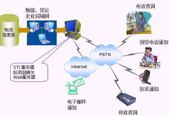 CTI服務(wù)器負(fù)責(zé)接入用戶的查詢請求,并根據(jù)用戶的要求進(jìn)行貨物查詢等操作;根據(jù)企業(yè)預(yù)先設(shè)置的撥號表逐一外撥到目標(biāo)用戶(貨主或收貨人)完成電話通知的功能。