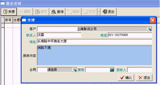 主要登記產(chǎn)品信息、客戶信息、服務(wù)合同、售后服務(wù)卡,接受客戶的投訴或請(qǐng)求,進(jìn)行派工和派工的跟蹤。