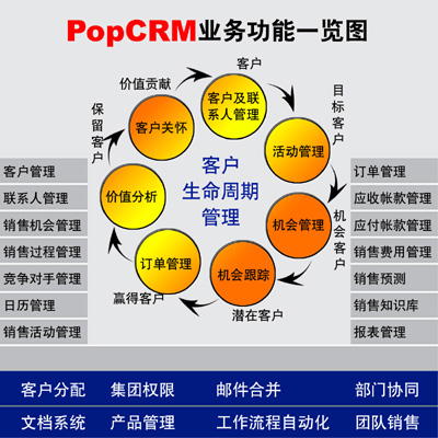 PopCRM吸收了國(guó)內(nèi)外先進(jìn)的管理思想,以客戶(hù)的需求為根本,以應(yīng)用價(jià)值為核心,聚焦銷(xiāo)售環(huán)節(jié),對(duì)客戶(hù)資源統(tǒng)一管理,規(guī)范銷(xiāo)售行為;對(duì)銷(xiāo)售進(jìn)行分析預(yù)測(cè),提供決策依據(jù);對(duì)客戶(hù)進(jìn)行全面分析,提供客戶(hù)關(guān)懷,吸引并留住客戶(hù),全面提高企業(yè)的盈利能力。