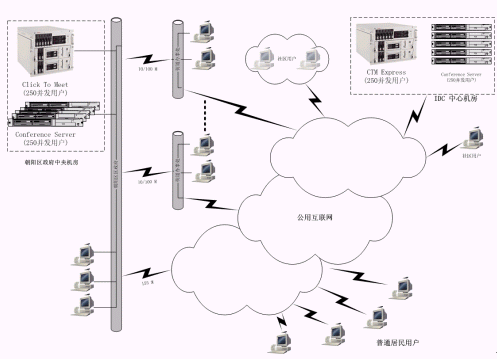 朝陽區(qū)政府的中心機(jī)房里放置多臺(tái)FVC公司的Conference Server,實(shí)現(xiàn)支持上千個(gè)并發(fā)用戶的超媒體會(huì)議支撐處理平臺(tái);在中心機(jī)房放置一套完整的超媒體會(huì)議管理系統(tǒng)(Click