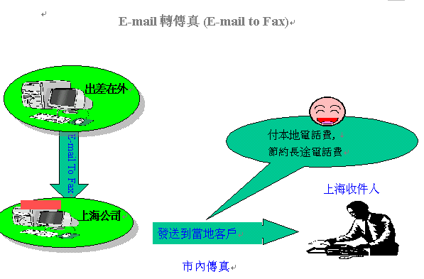 特別值得一提的是,E-mail轉(zhuǎn)傳真功能還能節(jié)省很多長途電話費(fèi),如李先生出差在香港,需要將傳真發(fā)回公司所在地上海的客戶,通過E-mail將傳真發(fā)送到上海公司的伺服器,伺服器再將傳真發(fā)送到李先生上海的客戶處,如此一來,國際長途傳真只收市話費(fèi),何樂而不為呢?!