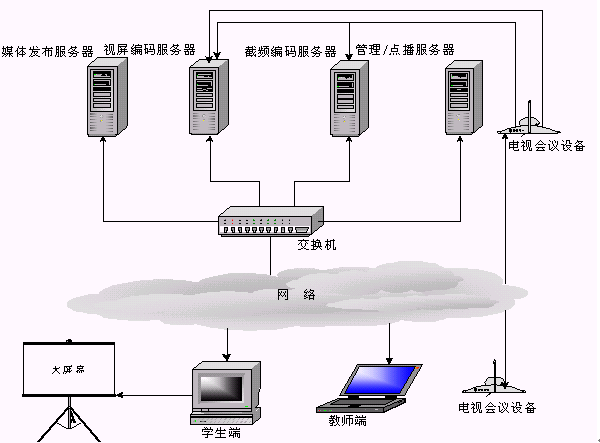 當(dāng)老師端在異地時(攝像頭離服務(wù)器較遠(yuǎn),無法物理連接),可通過"電視會議系統(tǒng)"將老師的圖像及聲音實時傳送到編碼服務(wù)器,桌面課件可以通過PcAnywhere傳送到編碼服務(wù)器。圖像,聲音和桌面課件通過Web Streaming采集壓縮并在網(wǎng)上實時廣播。這種系統(tǒng)架構(gòu)也是當(dāng)今功能比較齊全和完善的一種實現(xiàn)方式。