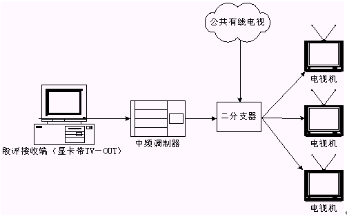 本系統(tǒng)接收端接收實時廣播時,除了用普通PC機(jī)收看,或把PC機(jī)接收到的信號輸?shù)诫娨暎ù笃粒┥鲜湛,甚至還可以接入有線電視網(wǎng)進(jìn)行播放。具體方法是通過一個接收端接收股評節(jié)目,通過帶TV-OUT的顯卡把TV信號輸出到中頻調(diào)制設(shè)備,中頻調(diào)制設(shè)備可以把基帶模擬信號轉(zhuǎn)換成一個有線電視信號,且傳輸距離遠(yuǎn),損失小,再把這個信號與有線電視信號一起接入一個二分支器(2進(jìn)1出),這就可以和公共有線電視共存,形成自己的頻道,供電視接收。