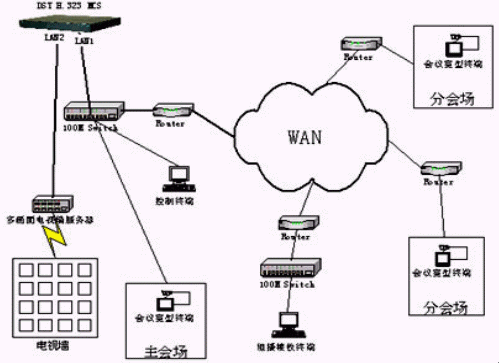 多點控制器采用鼎視通公司的DST H.323 MCS多點控制單元。DST H.323 MCS是鼎視通公司最新研制開發(fā)的高性能媒體交換設備,提供在分組交換網(wǎng)絡平臺之上的多種媒體交換服務。其面向的用戶既可以是企業(yè)、機關、學校等中小規(guī)模用戶,也可以是網(wǎng)絡運營商、業(yè)務提供商等大型用戶。并且它是唯一一款支持電視墻輸出的多點控制單元,同時結合鼎視通公司的多畫面電視墻服務器實現(xiàn)主會場電視墻的輸出。