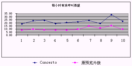 下圖可以看出使用原預(yù)覽外撥和采用Concerto預(yù)測外撥系統(tǒng)后單位座席每小時(shí)有效呼叫數(shù)量的比較: