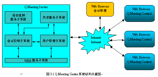 由于采用基于WEB的客戶端,Q.Meeting Center的部署是比較簡單的。只需按Q.Meeting Server的運(yùn)行環(huán)境要求安裝配置好會議服務(wù)器即可。主持人和其他與會者使用普通PC機(jī)通過WEB瀏覽器訪問會議URL地址即可參加會議。