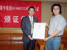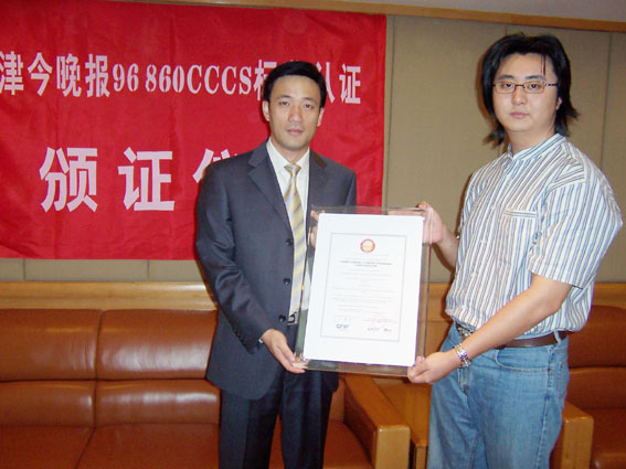 2004年9月9日,天津今晚報公眾服務(wù)中心通過了《全國呼叫中心運營績效標(biāo)準(zhǔn)》(CCCS-OP-2003)認(rèn)證,并獲得由中國信息化推進(jìn)聯(lián)盟客戶關(guān)系管理專業(yè)委員會頒發(fā)的認(rèn)證證書(四星級客戶服務(wù)中心),成為國內(nèi)傳媒業(yè)首家通過此認(rèn)證的呼叫中心。