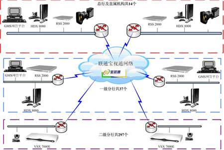 傳輸層:采用網(wǎng)通“寶視通”視頻會議運(yùn)營網(wǎng),該網(wǎng)架構(gòu)在網(wǎng)通IP數(shù)據(jù)骨干網(wǎng)和本地傳輸與接入網(wǎng)之上的業(yè)務(wù)網(wǎng),采用H.264協(xié)議,面向民生行提供可管理的商用視頻會議網(wǎng)。