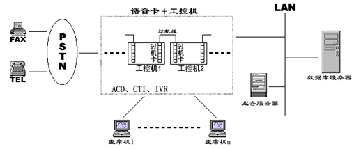 在一些小型CALL CENTER系統(tǒng)中,人們通常通過語音板卡加工控機的方式搭建系統(tǒng),通常一臺設備就集成了ACD、IVR、CTI等各種資源,各資源的使用、調派通過軟件進行控制,有效的解決了建設成本高、系統(tǒng)構造繁復的問題,具有相當?shù)撵`活性。然而由于工控機和語音板卡容量有限,同時其標準最多只能是工業(yè)級標準,因此在構建相對大型的呼叫中心時就總是捉襟見肘。為了增加系統(tǒng)容量,解決多臺PC之間進行通道交換的難題,人們又設計了過機卡和過機線來解決,其應用系統(tǒng)如下圖: