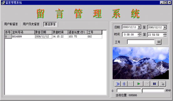 當(dāng)系統(tǒng)中無話務(wù)員登錄或等待超過20秒,則進(jìn)入語音信箱服務(wù)。語音信箱在進(jìn)入時(shí)提示用戶:“系統(tǒng)正忙,請留下您的聯(lián)系電話,復(fù)本機(jī)號請掛機(jī),復(fù)其他號碼請輸入電話號碼,按‘#’號鍵結(jié)束,或者在聽到‘嘟’的一聲之后留下你的留言”,當(dāng)主叫號碼位數(shù)不夠7位時(shí),提示:“系統(tǒng)正忙,請輸入您的聯(lián)系電話,按‘#’號鍵結(jié)束,或者在聽到‘嘟’的一聲之后留下你的留言”,系統(tǒng)將客戶留下的電話號碼記錄到數(shù)據(jù)庫中。將留言存放到一個(gè)指定目錄中,用話務(wù)號作為語音文件名。