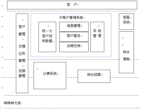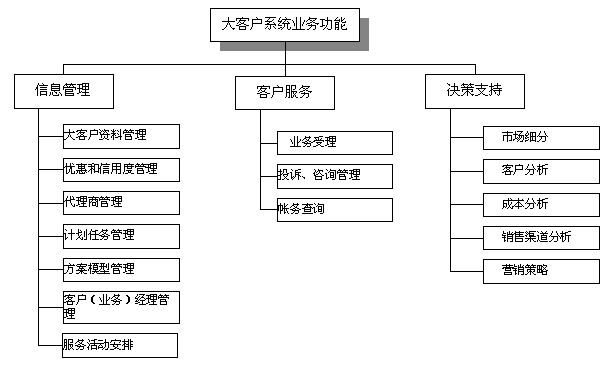 電信大客戶管理系統(tǒng)是在收集大客戶市場調(diào)查信息、大客戶資料信息、大客戶經(jīng)營戰(zhàn)略資源的基礎(chǔ)上,自動采集專業(yè)計(jì)費(fèi)、綜合營帳、客服、網(wǎng)管、財(cái)務(wù)等系統(tǒng)的相關(guān)數(shù)據(jù),實(shí)現(xiàn)快速、全面、準(zhǔn)確的新客戶業(yè)務(wù)受理、新增需求受理及故障處理過程通道,實(shí)現(xiàn)完善的客戶經(jīng)理管理、代理商管理系統(tǒng),最終實(shí)現(xiàn)完整的大客戶滿意度評估體系和針對大客戶的個(gè)性化服務(wù)。建成后的系統(tǒng)從管理、服務(wù)、分析三方面出發(fā)主要應(yīng)具備信息管理、客戶服務(wù)、決策支持功能。